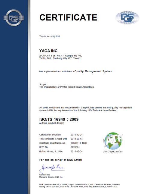 雅嘉電子宣佈,已榮獲UL DQS優麗國際管理系統驗證股份有限公司,在車規用PCBA的製造服務範圍, 取得ISO/TS 16949汽車產業品質管理系統品管認證。透過全體員工的參與努力,關鍵流程符合嚴格的認證要求,藉此提升對客戶服務能力,並深耕車規產品市場。